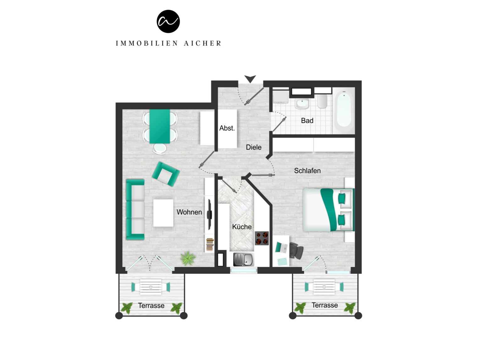 - ca. 52 m² Wohnfläche im EG mit zwei Terrassen und eigenem kleinen Garten