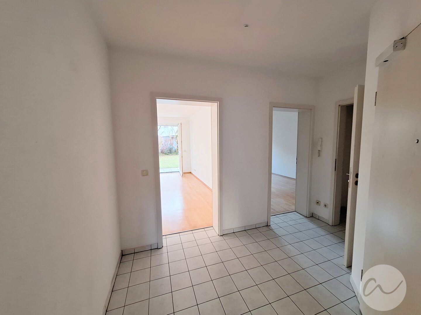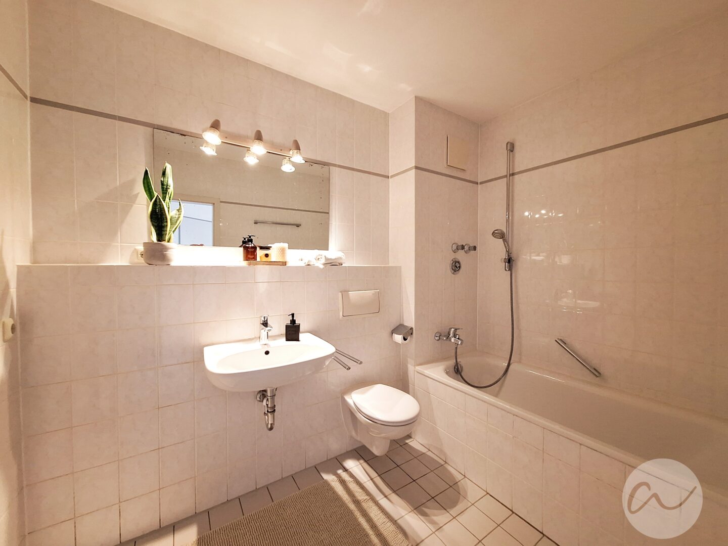 Das Schlafzimmer mit Gartenblick bietet erholsame Ruhe. Das Bad mit Wanne und Waschmaschinenanschluss ist in zeitlosem hellgrau gehalten rundet das stimmige Raumkonzept ab.