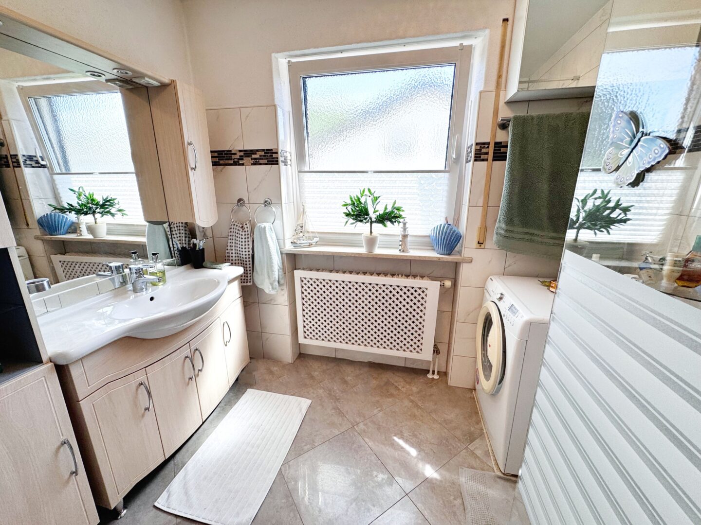 Direkt vom Esszimmer gelangen Sie in das modernisierte Tageslichtbad. Es ist mit einer Regendusche, einem breiten Waschtisch, Waschmaschinenanschluss sowie ausreichend Platz für Badezimmermöbel ausgestattet – zeitlos, komfortabel und stilvoll zugleich.