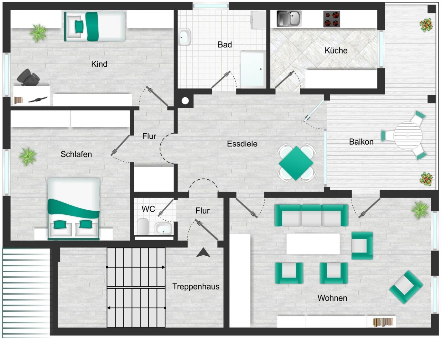 Beim Betreten der Wohnung empfängt Sie ein kleiner Eingangsbereich, von dem linker Hand das separate WC zugänglich ist. Der Flur öffnet sich in das einladende, helle Esszimmer, das durch seine zentrale Lage zum kommunikativen Mittelpunkt der Wohnung wird. Von hier aus erreichen Sie sternförmig alle weiteren Räume – ein durchdachter Grundriss, der viel Offenheit und Wohnkomfort schafft.