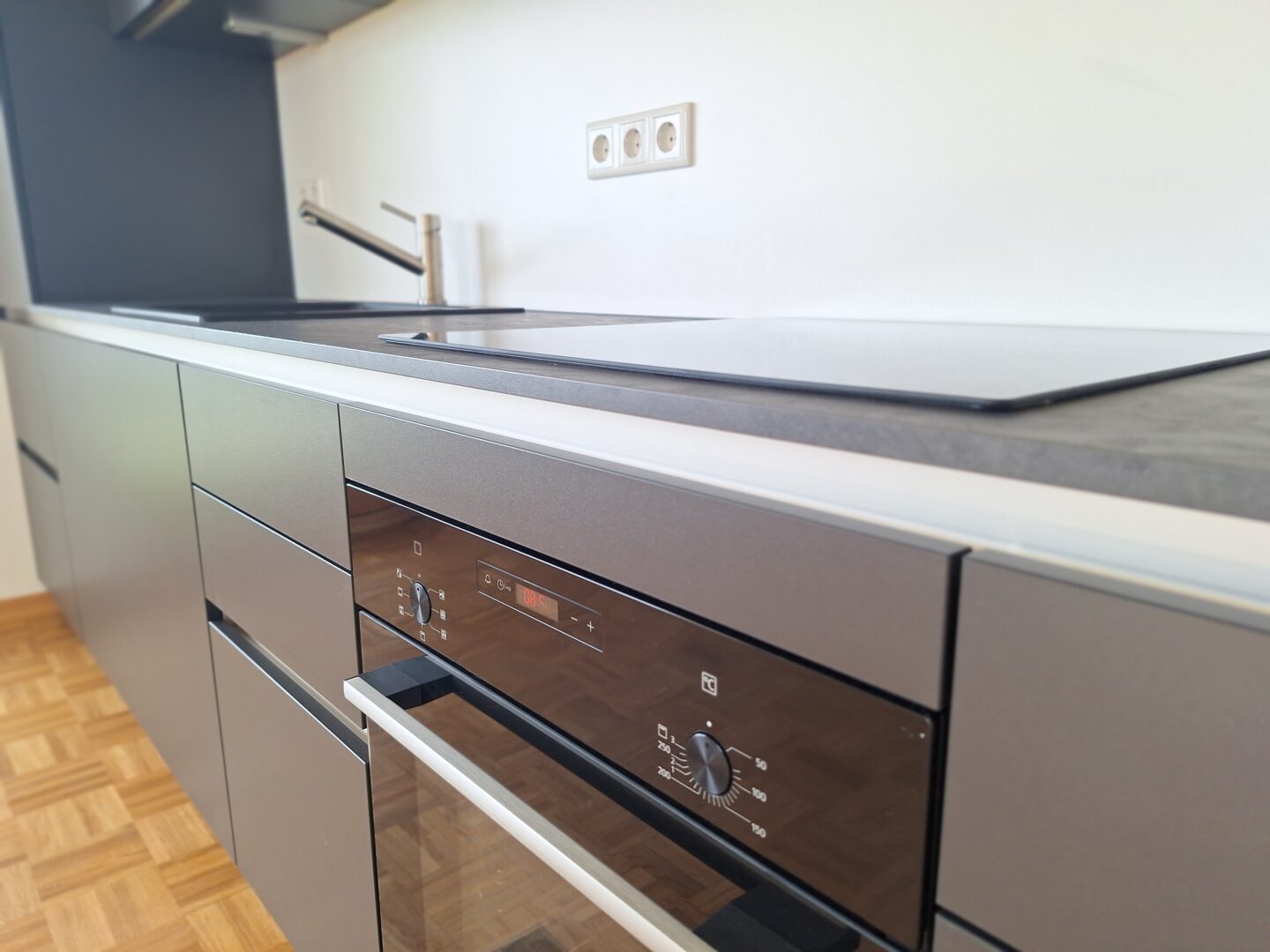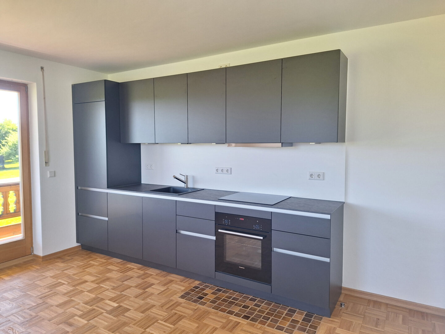 Dieser Raum bietet eine große Fensterfront mit Zugang zum Südbalkon und Weitblick über Wiesen und Felder bis hin zur Alpenkette. Die Einbauküche enthält: Kühlschrank inkl. Gefrierfach, Induktionskochfeld, Backofen und Spülmaschine.