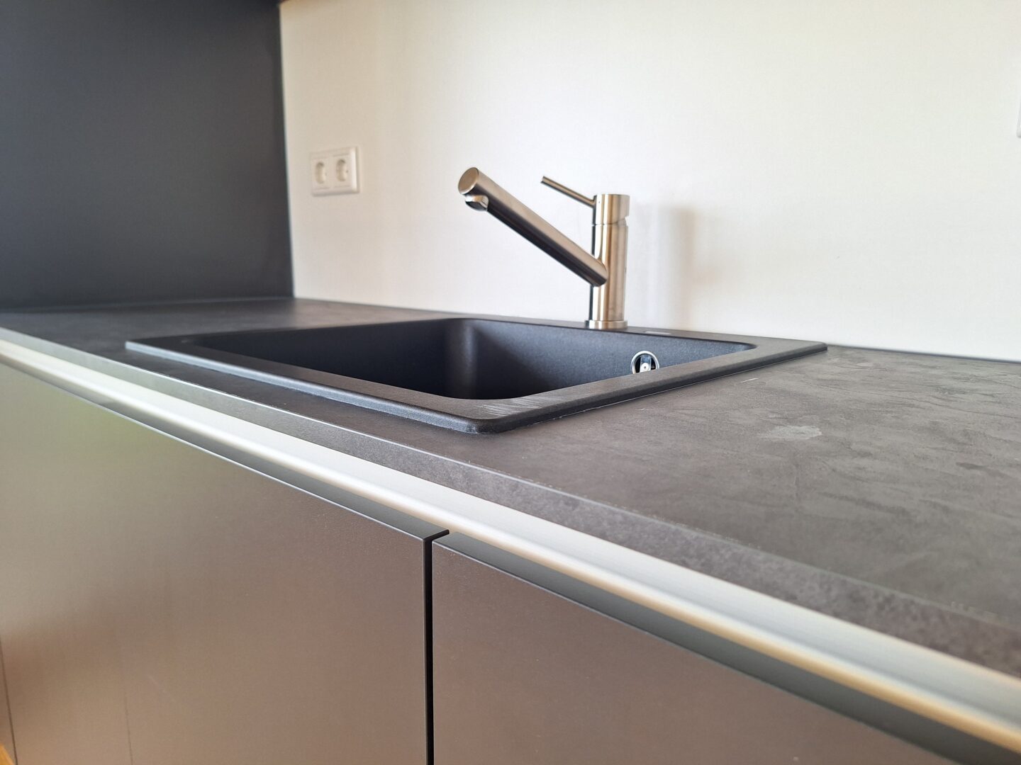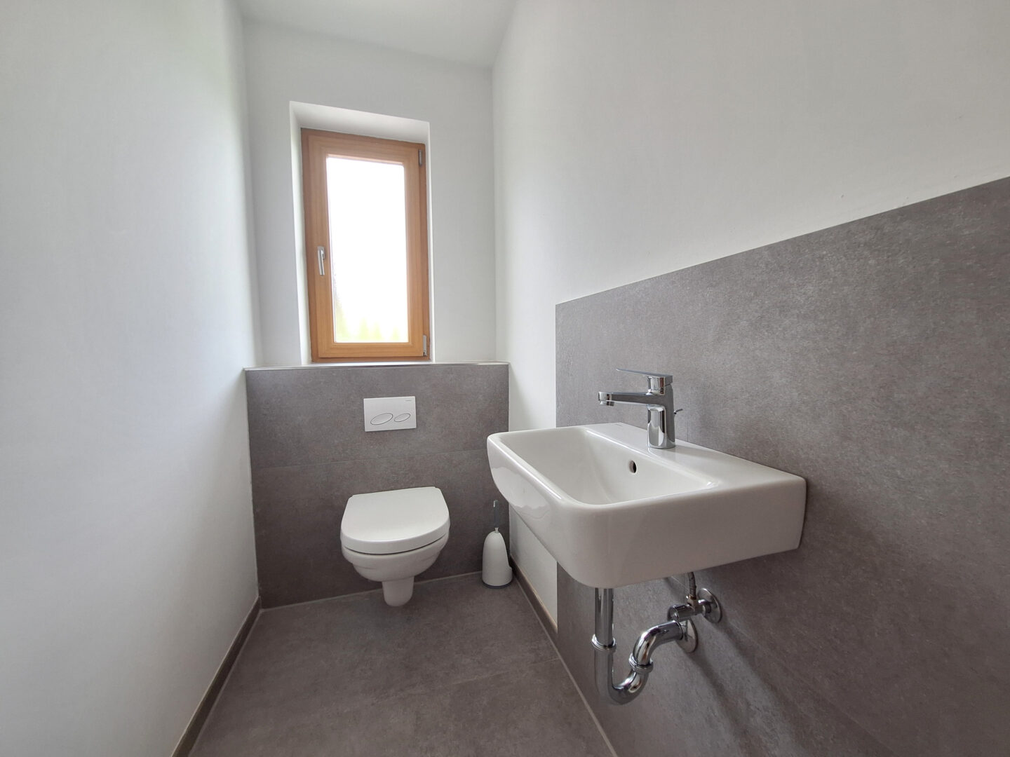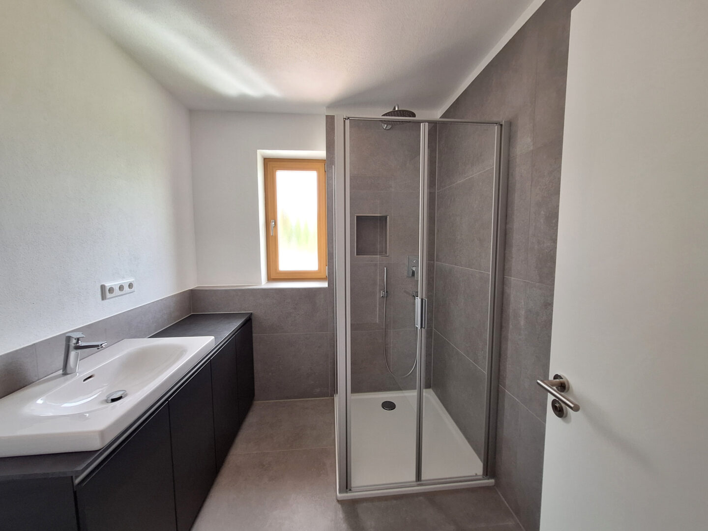 Linker Hand liegt das separate WC mit Fenster - modern gefliest mit großen grauen Fliesen - sowie das Tageslichtbad, welches mit Regendusche, Waschbecken, modernem Unterschrank, Waschmaschinenanschluss sowie einem Fenster für natürliche Belüftung ausgestattet ist.