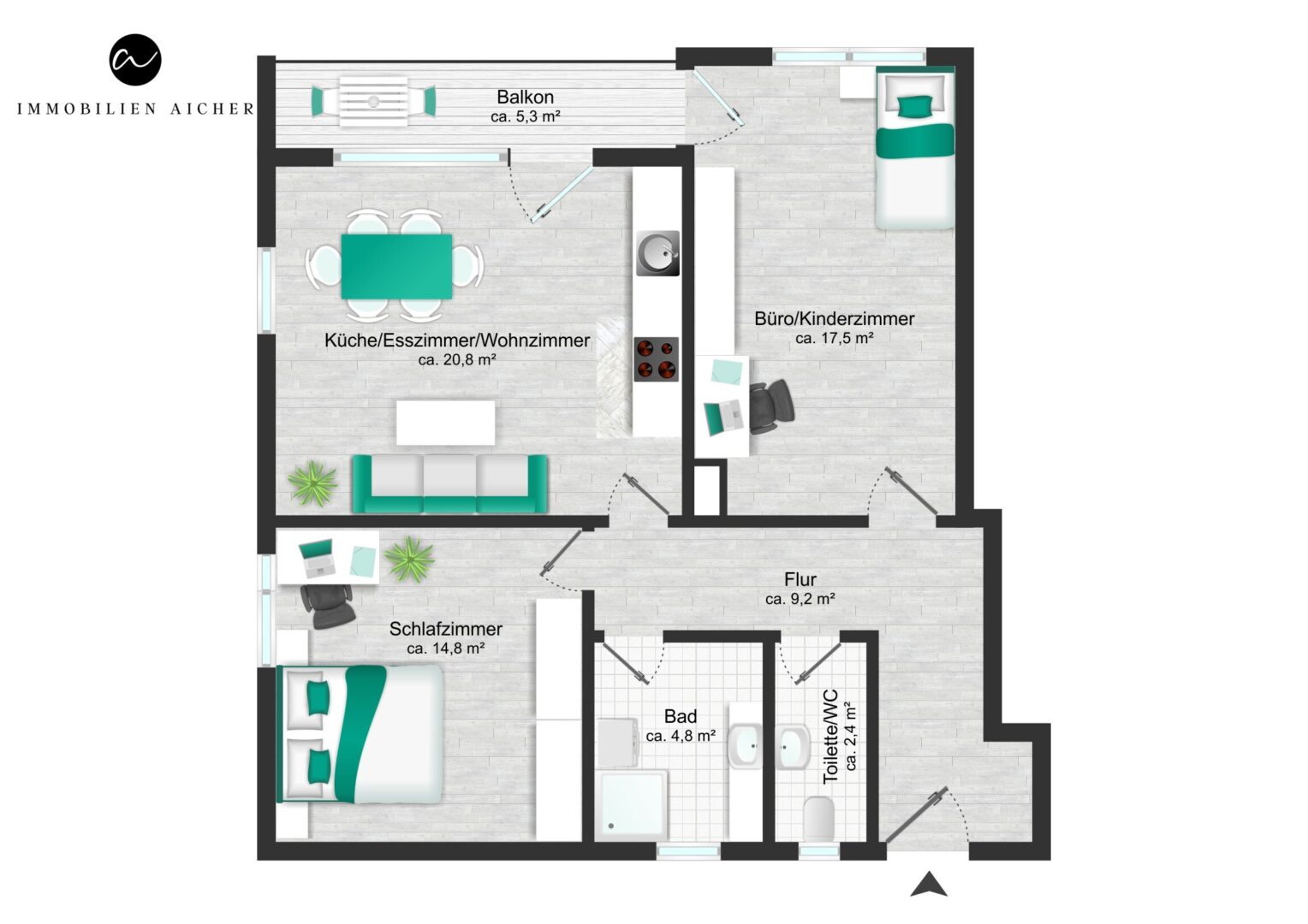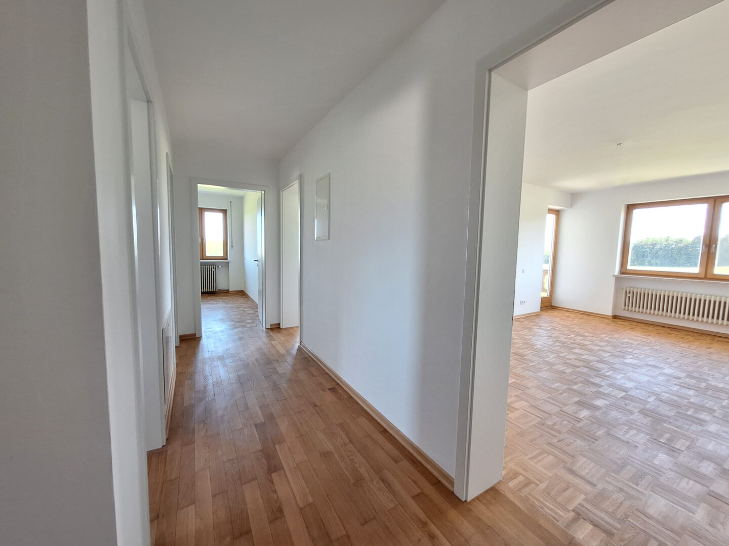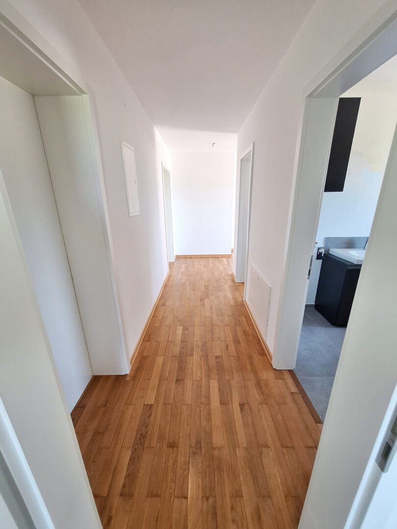 Der helle Flur verbindet alle Räume der Wohnung. Rechter Hand befindet sich ein ca. 17 m² großer Raum mit Zugang zum Südbalkon und traumhaftem Blick in die Berge. Dieser Raum kann flexibel genutzt werden – z. B. als Schlafzimmer, Home Office oder Kinderzimmer.
