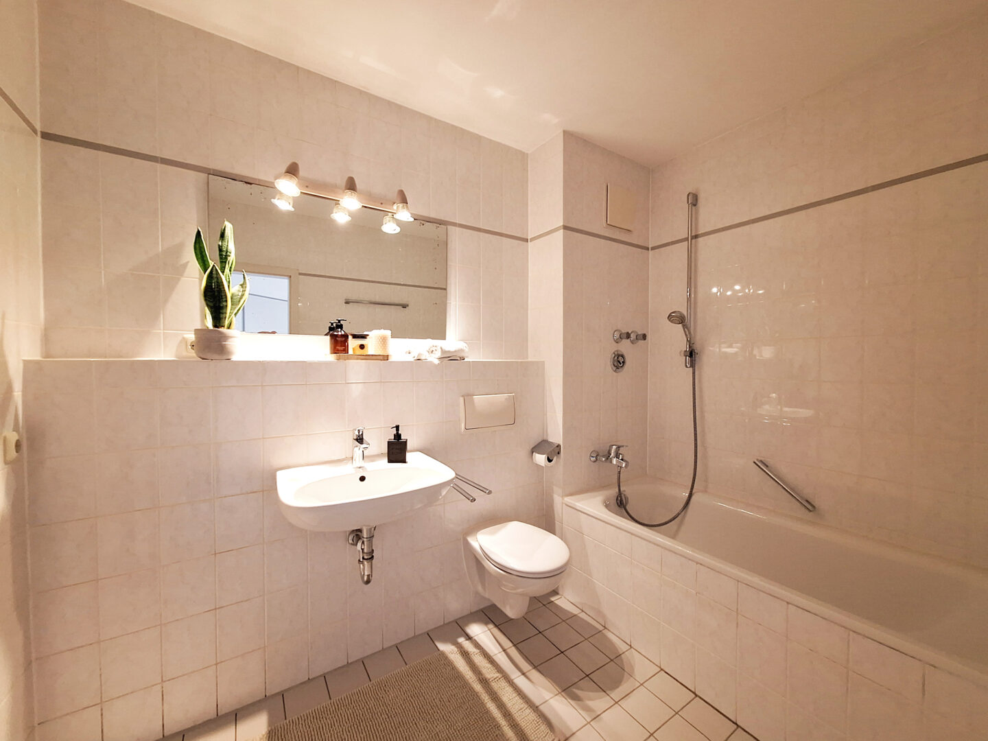 Das Schlafzimmer mit Gartenblick bietet erholsame Ruhe. Das Bad mit Wanne und Waschmaschinenanschluss ist in zeitlosem hellgrau gehalten rundet das stimmige Raumkonzept ab.