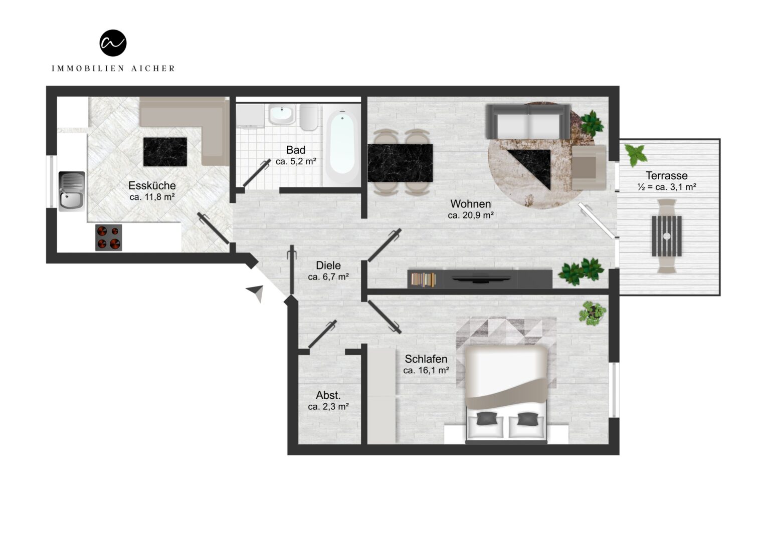 Die Südausrichtung schenkt der Wohnung viel Licht und einen schönen Blick in den Gemeinschaftsgarten. Vom Wohnzimmer aus betreten Sie die Terrasse, ein wunderbarer Ort für den Morgenkaffee oder entspannte Stunden im Freien.