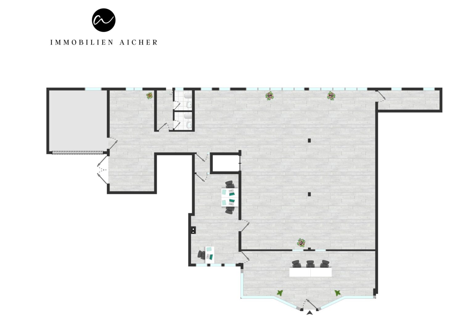 Dieser ist über die Bürofläche (ca. 32m²) begehbar. Das Büro ist zudem mit der taghellen Produktions-/Lagerfläche verbunden. Diese besticht mit einer durchgehenden Fensterfront zur Westseite und könnte daher leicht zu weiteren Büroflächen umgebaut werden. Eine Garage mit elektrischem Rolltor und Fenster sowie ein separater großer Eingang (doppelflügelige hohe Türe) zur Anlieferung von Waren ist ein weiterer Pluspunkt der Immobilie.